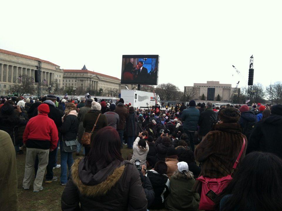 That wasn’t so bad. Like most people closer in on the mall, we had to rely on a JumboTron showing what was going on. How did people hear inaugurations before such things were invented? It would have been tough to catch live speeches from the Congressional platform alone.