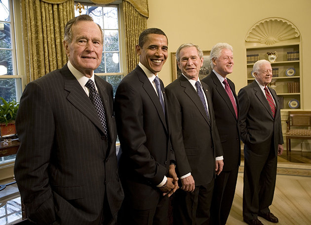It will be the first time Barack Obama, the two Bushes, Bill Clinton and Jimmy Carter have met together since just before Obama’s inaugural more than four years ago. The presidential library commemorating the two terms of the 43rd president covers the Sept. 11 terror attacks, the Katrina Hurricane, the Iraq and Afghanistan wars and the financial meltdown and will open to the public May 1.