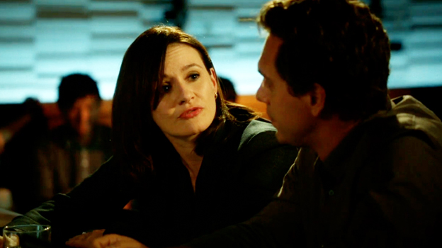 It probably is meant to refer to drinks, though, and as contrasted with last week’s change of pace, that took place entirely in the newsroom, this one is spread over a number of barrooms, where Don is initially drinking by himself before he is joined by MacKenzie; where Maggie is drinking by herself before she picks up some random guy; and at dinner where Jim is reunited with his campaign bus squeeze Hallie and the rest of the expanded dinner party have reason to drink.