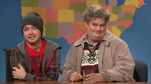 And speaking of relations, Drunk Uncle brought in his own kin, Meth Nephew, which was Aaron Paul playing his Jesse Pinkman character from “Breaking Bad.” His cameo had already singlehandedly saved the typically all-over-the-map cold open, involving Jay Pharoh’s Obama trying to explain health care reform before Pinkman arrives and speaks of a friend who was forced to cook meth to pay for cancer treatments before Obamacare came to pass. It was a nice touch, and an great surprising cameo. But, again perhaps worried about the cast’s overall lack of star power, Paul was used two other times, both dressed as Pinkman, for the same essential reason — a cameo to goose up or close a skit, one for an ad for a smokeless product, eMeth, the other alongside Drunk Uncle. The first time is fine, but the third is a little unsurprising.