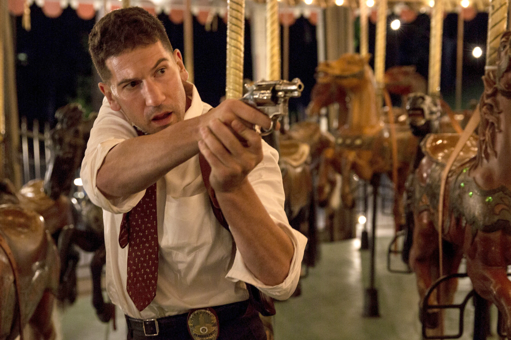 Bernthal was in a 40s suit, as were the other actors on the lavish set, though is face was covered in bandages. (“Every great Noir hero gets the shit beat out of him progressively as the story goes on,” Darabont says).