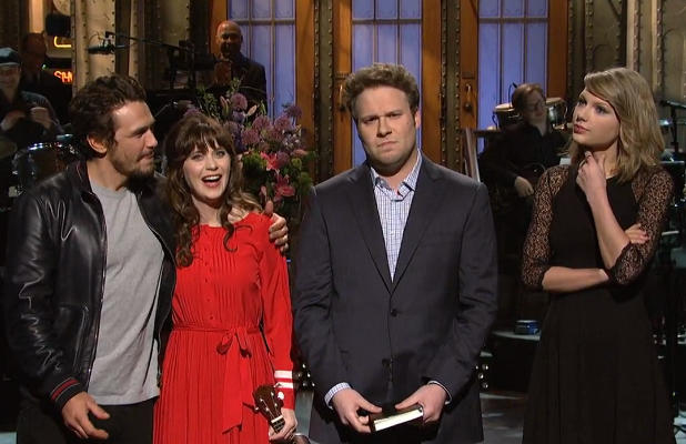 On to the monologue: Rogen read from his diary of the week, which served as a pretty reliable predictor of the rest of the show: A lot of pot jokes. He said he didn’t need a lot of cameo guests to support him, but he still got Zooey Deschanel, James Franco and Taylor Swift to join him.