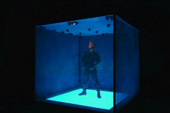 In the Gate Theatre production directed by Christopher Haydon, she’s behind the mesh of show’s six-foot cube, looking almost like a statue of a soldier from the ages. But rather than standing at the ready, we learn as the show begins, she’s admiring herself in the mirror.