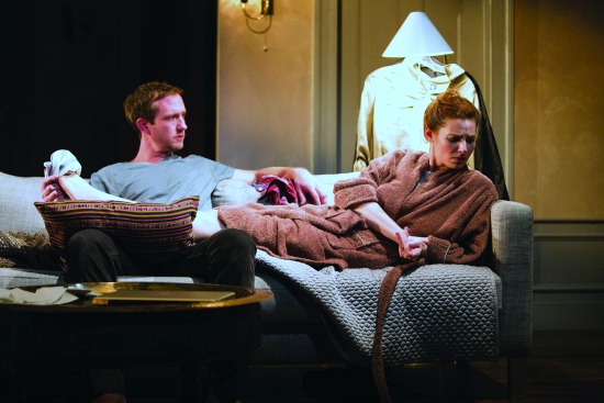 While Debra Booth’s set, with seemingly working kitchen, bathroom and bedroom off the wide living room, is not quite the bohemian pad described in other productions, it’s sleek and solid in its skylights, so much so that it’s also kind of claustrophobic — for the audience as well as the couple at hand; we all know that no action iwill take place anywhere else (darn, and I so wanted to see Paree!).