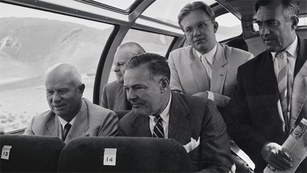 American gathered on the roadside to see the gregarious character and his wife drive by, but they did not cheer or wave back to the Soviet Leader. A flight to Los Angeles following a train trip to New York provided the most surreal moments, as he addressed a Hollywood luncheon attended by Marilyn Monroe and Frank Sinatra, witnessed the filming of the musical “Can-Can” and scolded the Los Angeles Mayor for canceling a trip to Disneyland and bringing up that “we will bury you” quote again.