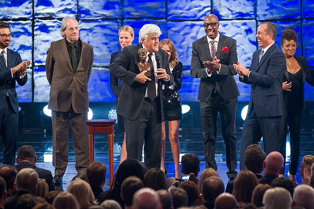Jay Leno returns to TV in a big way as recipient of “The Mark Twain Prize” (PBS, 8 p.m., check local listings). His “Tonight” show successor Jimmy Fallon, Chelsea Handler, former bandleader Kevin Eubanks, Jerry Seinfeld, Wanda Sykes, Seth Meyers, Garth Brooks and many more travel to the Kennedy Center to induct him, in the event taped last month in Washington. With any luck, he will refrain from going Jay Walking.