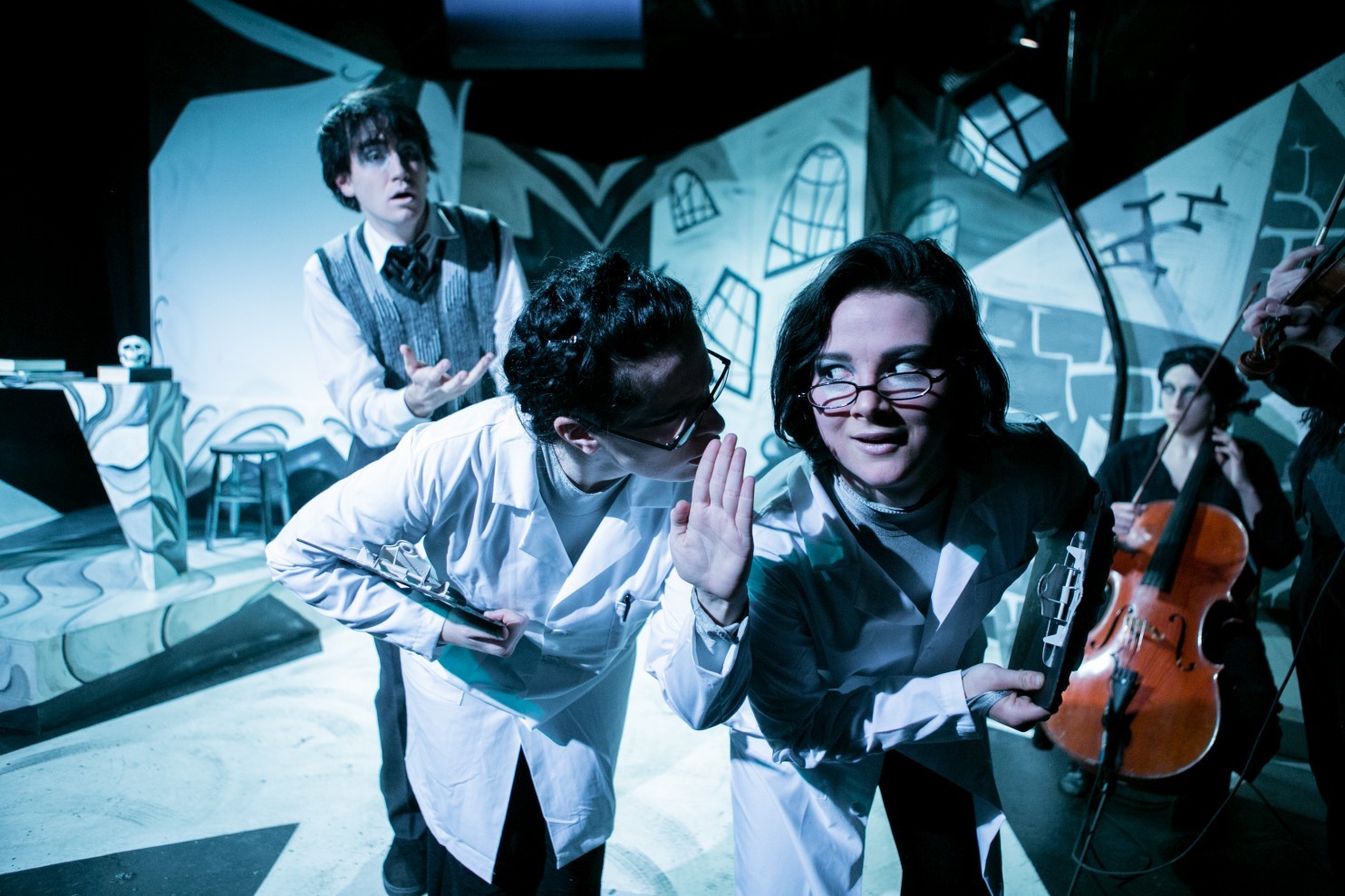 More than that, the stage version directed by Matt Reckeweg uses the same monochromatic scale of grey to black scale of black and white film and is performed silent. That isn’t to say it doesn’t speak loudly, through its vivid action and especially the jarring, effective score by Michael Winch, an inventive violinist who performs it live on stage with cellist Madeline Waters and bassist Rick Netherton.