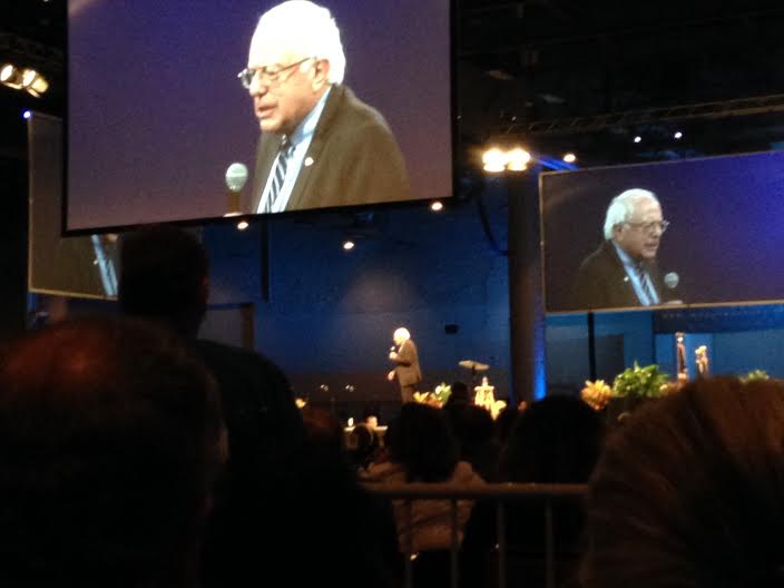 So Hillary Clinton, Bernie Sanders and Martin O’Malley each had time to expand their speeches — all far exceeding the time limits on discreet clocks on the center stage, and whip up their fans in the stands. Sanders came first with a variation of his populist stump speech that turned up the direct criticism of Clinton without saying her name. His supporters, along one end of the cavernous room, cheered loudly, some holding light up letters that spelled his first name. They had begun their chants while waiting to get through the metal detectors, “This is what democracy looks like!” (Gridlock?).