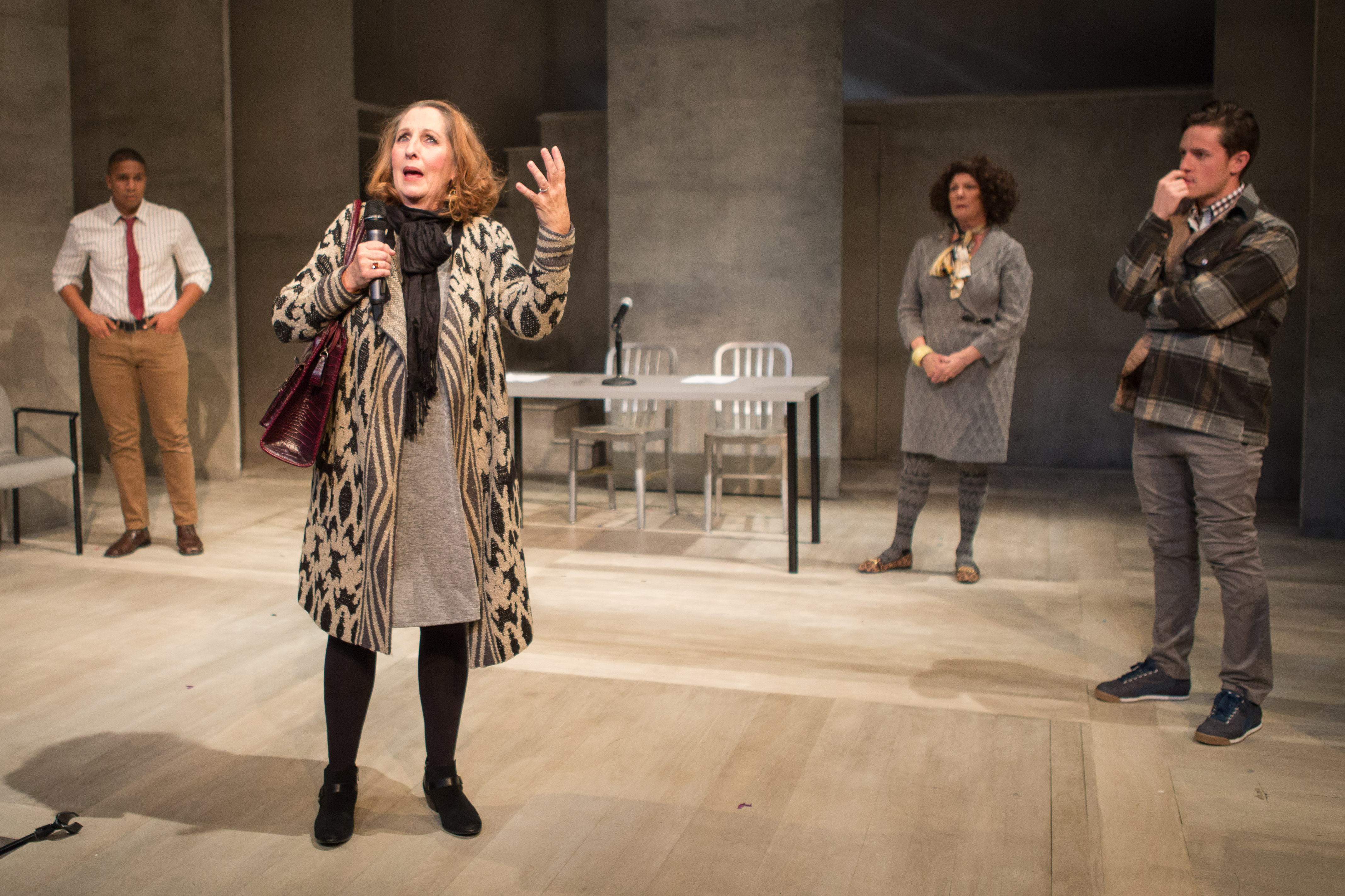 Getting most out of their roles, perhaps, are two assigned to multiple parts — Vanessa Bradchulis as a physician’s assistant and particularly a school board member trying to control a meeting; and Cam Magee doing great work in smallest roles in a bus station, on the board, but particularly as a kindly ex-teacher in the physical therapy room. The two of them understand the deepest, perhaps, the depth needed to reflect humor and drama. (Cleary, by contrast, as the flighty boss, is way over the top at every moment).