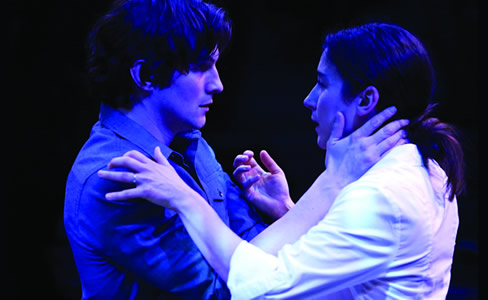 The already tight confines of the fourth floor Studio X is further intensified by a circular ring of seats so close to the actors you can see them twitch. And these two bring it on with one another; at varying degrees soft, sharp, sexy, saddened, tentative and harsh as each variation plays out. And how exactly do they get all of this straight? It’s hard enough for a two person play to remember all of one’s lines, but how about a dozen different scenes that start out the same way but veer off differently? How can they recall which version they’re in.