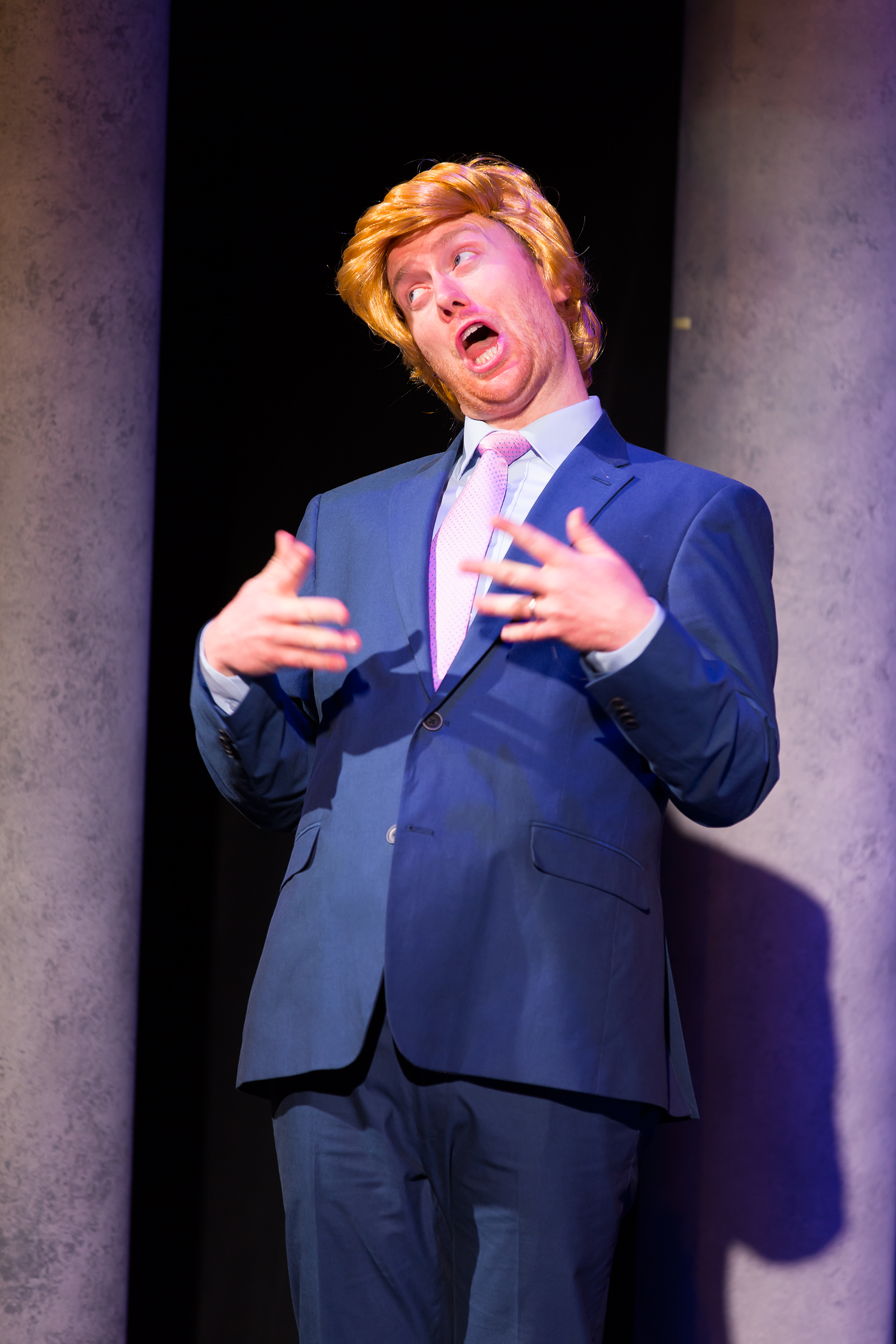 The most complex may be a takeoff of “Hamilton” reserved for its most revered embodiment of current political comedy, Trump, played by Andrew Knox in a yellow wig.