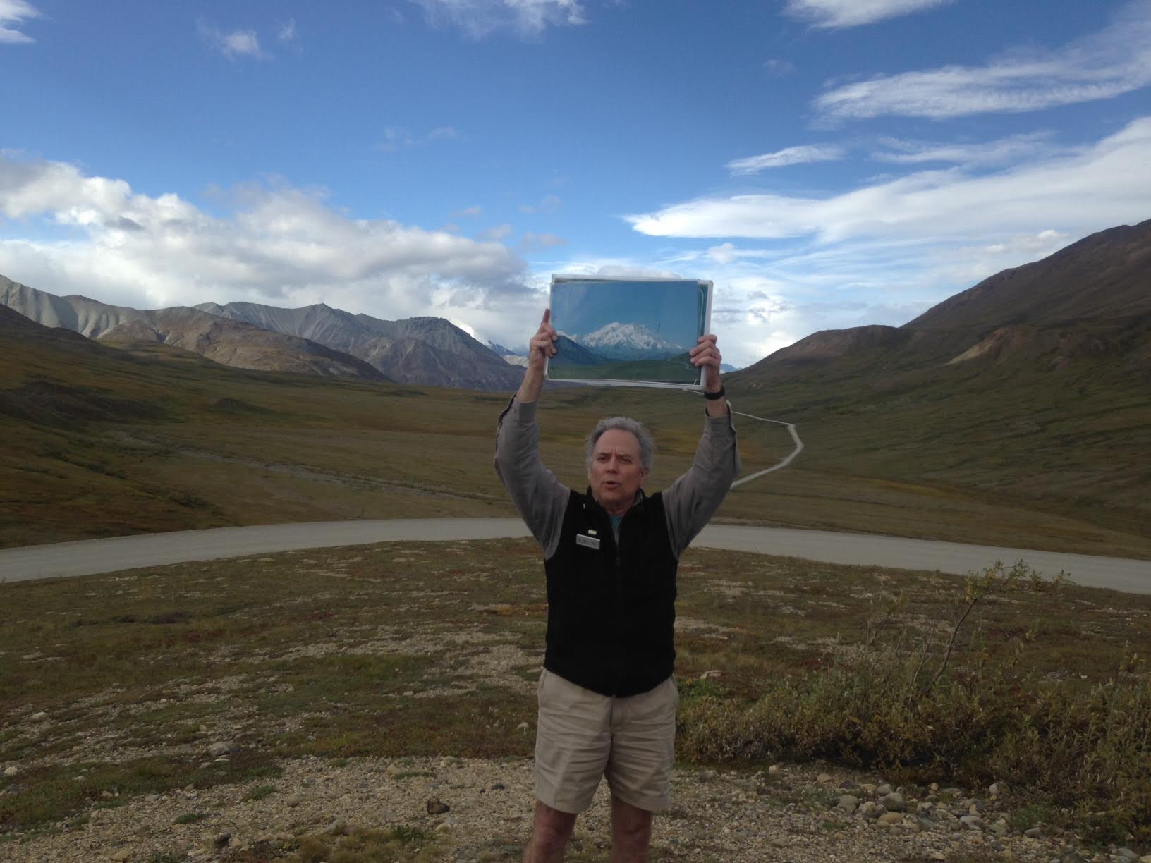it’s awe-inspiring, of course, in part because the former Mount McKinley is so much bigger at 20,000 feet than the neighboring mountains (which are pretty striking anyway). It’s so big that it creates its own weather systems, leaving it in clouds for most of the year. Which is why a parks guy hoisted a sign of what it looks like on a clear day in front of where the peak should have been. He might have done that for wildlife too since my fellow tourists were mad for seeing moose, bear, caribou, eagles or just about anything. They swooned over a swan and even a squirrel at one point.