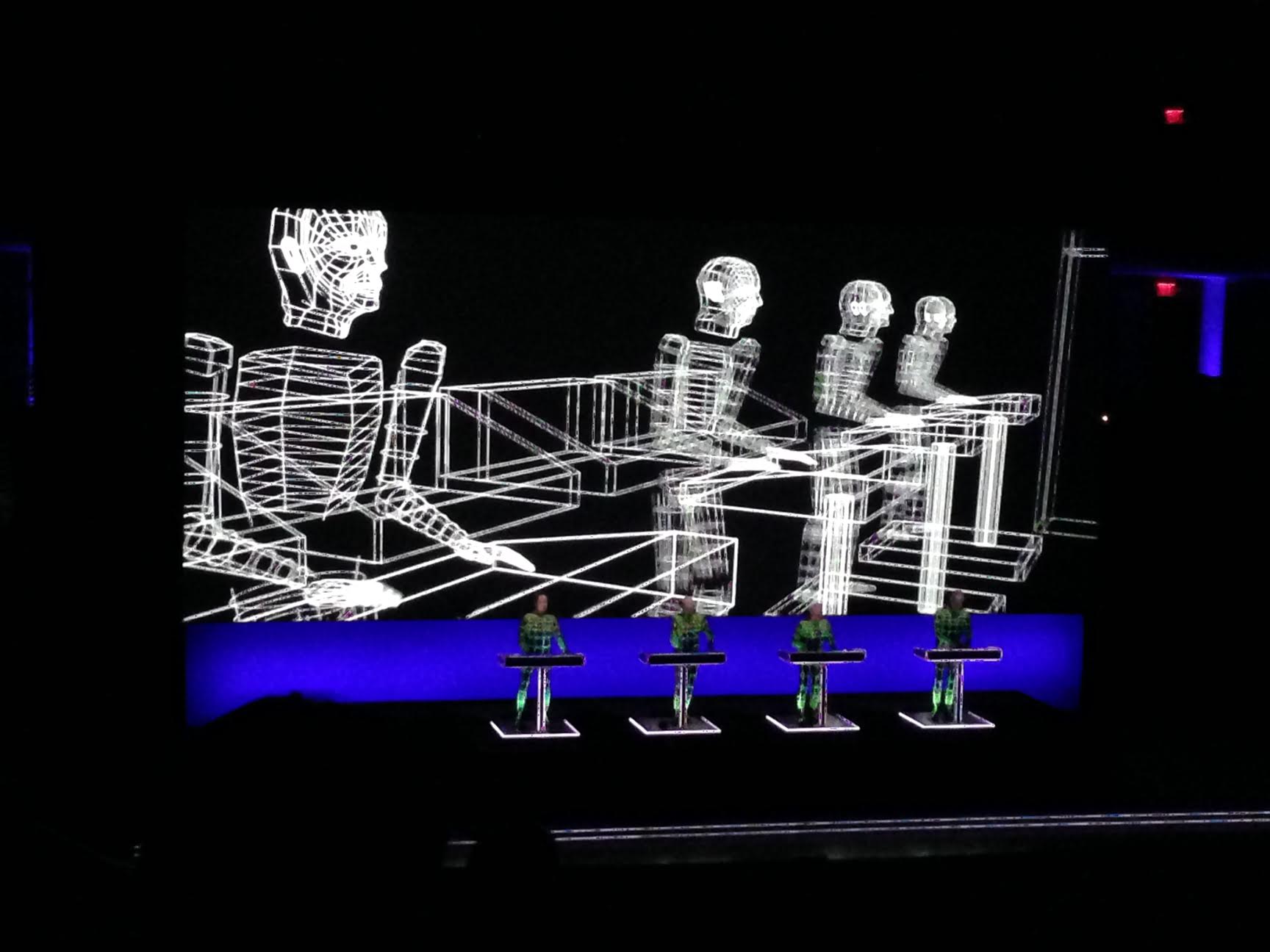 In theory, every live appearance is a 3D concert, right? But for Kraftwerk’s current U.S. tour, which kicked off Saturday in Bethesda, patrons were given 3D glasses upon entry. The band, indeed, was live for the most part, if you count standing mainly motionless at a series of consoles.