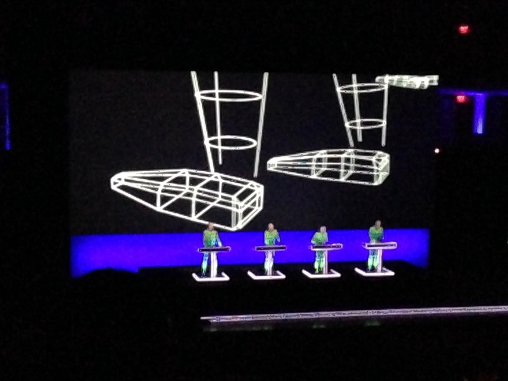 But the glasses came in handy in turning the images on the backing screen into little graphic space. That meant the digits on the opening “Numbers” floating out in sequence, or undulating on a grid, before a seemingly three dimensional scale of that 1981 era terminal floated out front and center during “Computer World,” and a VH bug appeared to herald “Autobahn.”