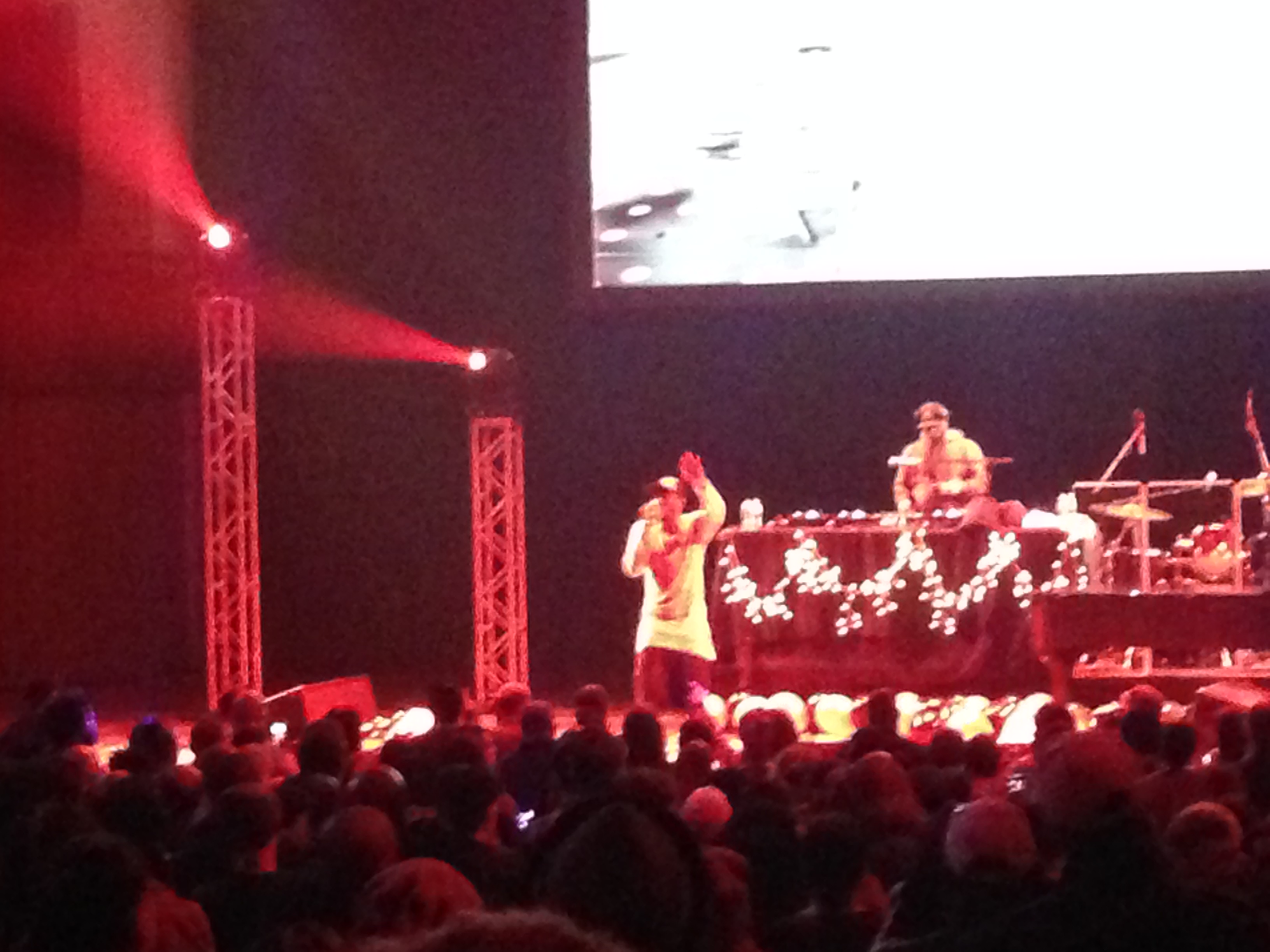Entering the stage nearly an hour after the 8 p.m. start time, he dove into his inventive rhyme mixed with a world music so enticing, he sometimes just grooved to the instrumental break. After his tracks “No Time to Pretend” and “Smiley Man,” he paused to admit “there’s so much I want to do. This whole week has been way out.”