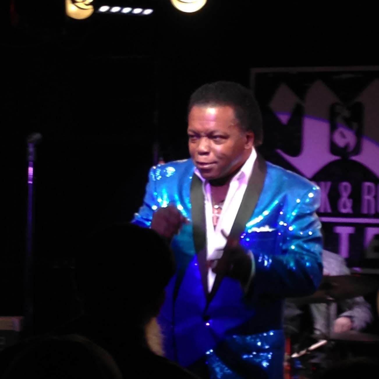 Round about showtime Saturday night, as the backing band the Expressions were churning out the cool and lightly funky sounds of the past, the way serious students from Greenpoint, Brooklyn could do, in their matching paisley tux jackets, out came the front man in his sparkly blue tux jacket.