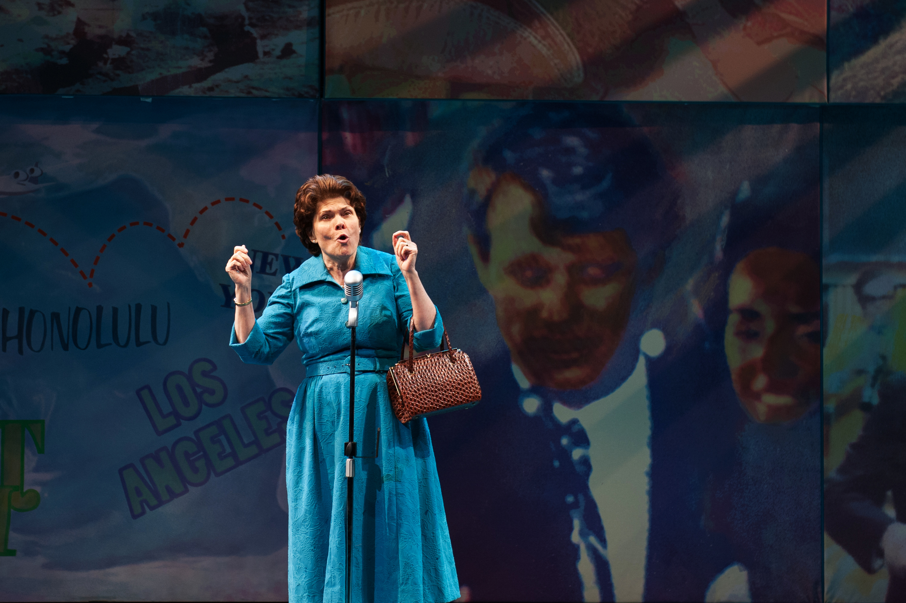 But “Mrs. Miller Does Her Thing,” named after the final album before her later obscurity (an acid rock thing I’m dying to get my hands on), has already shaped into a flashy product, with Ettinger’s two-story stage and turntable set changes, an offstage band that handles the 60s ditties and a remarkably accomplished cast led by Monk.