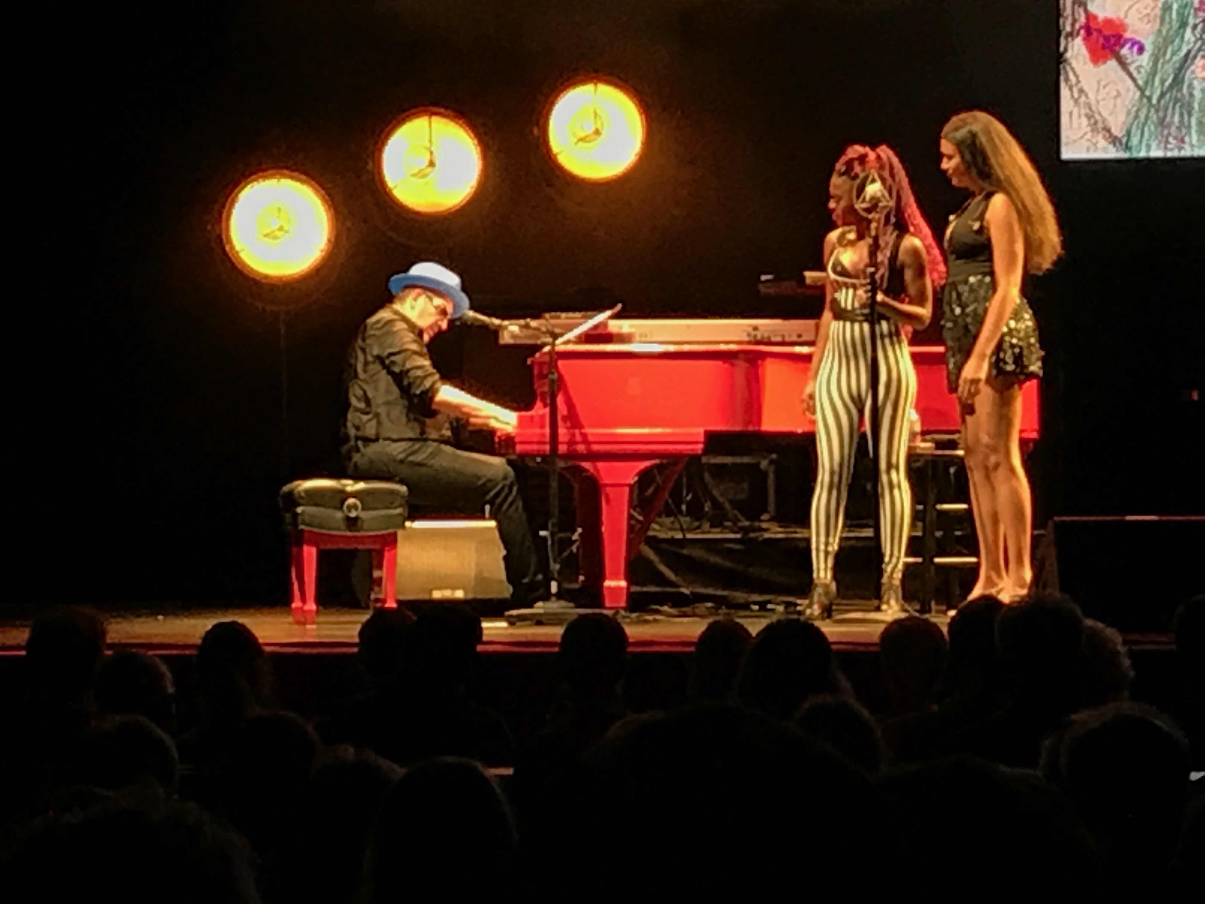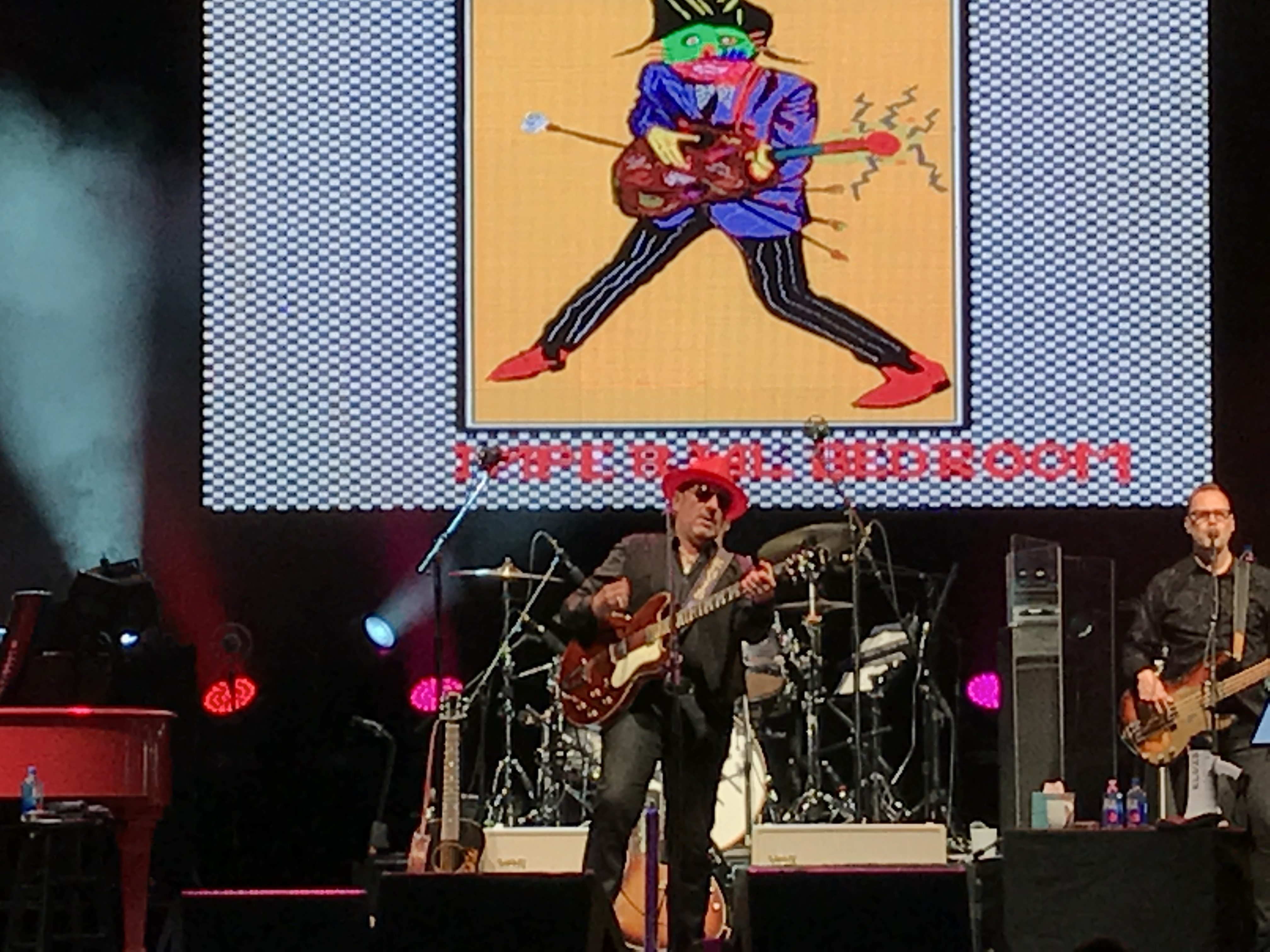 With brash, colorful paintings that alternated between revised variations of Costello’s iconic album covers in the style of Barney Bubbles’ original “Imperial Bedroom” art, and pulp novels, Costello wore an array of hats – red for the main set, then blue in the first encore, and a lavender in the second.