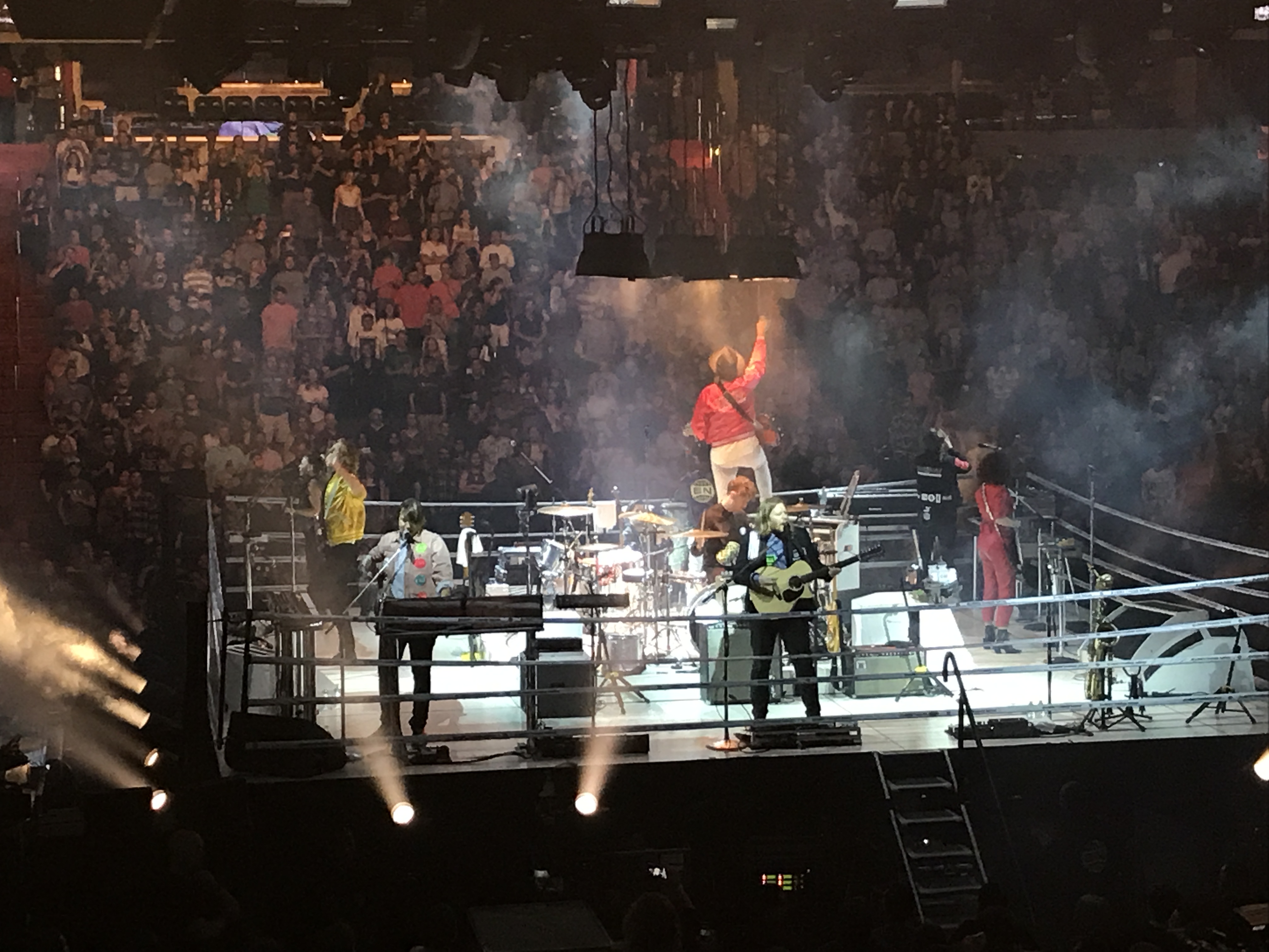 IMG_4553Playing in the round isn’t always the best way to take in an arena concert. By definition, a band’s presentation is fractured in different directions, lacking a central, unified focus. Every time a band member is facing you means that another is facing the other way. If it’s a spinning stage, it can all be a little dizzying.