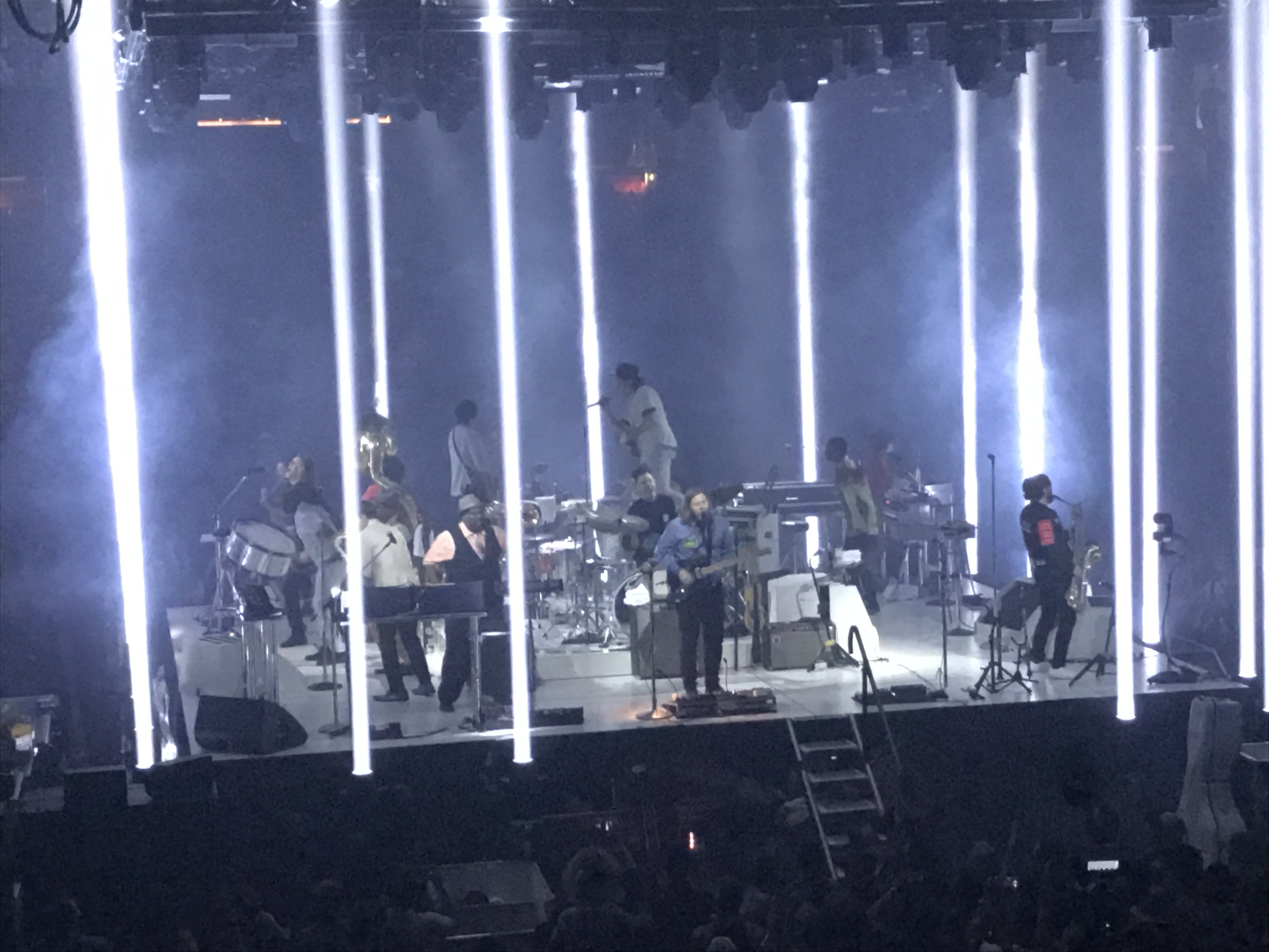Wireless microphones allowed singer Win Butler and Régine Cassagne to wander the stage at will. Different platforms on the stage, from monitors to piano tops allowed them to stand out further on different levels. And yes, a central platform did spin around at times, moving mostly the drum set of Jeremy Gara as well as the standup piano.