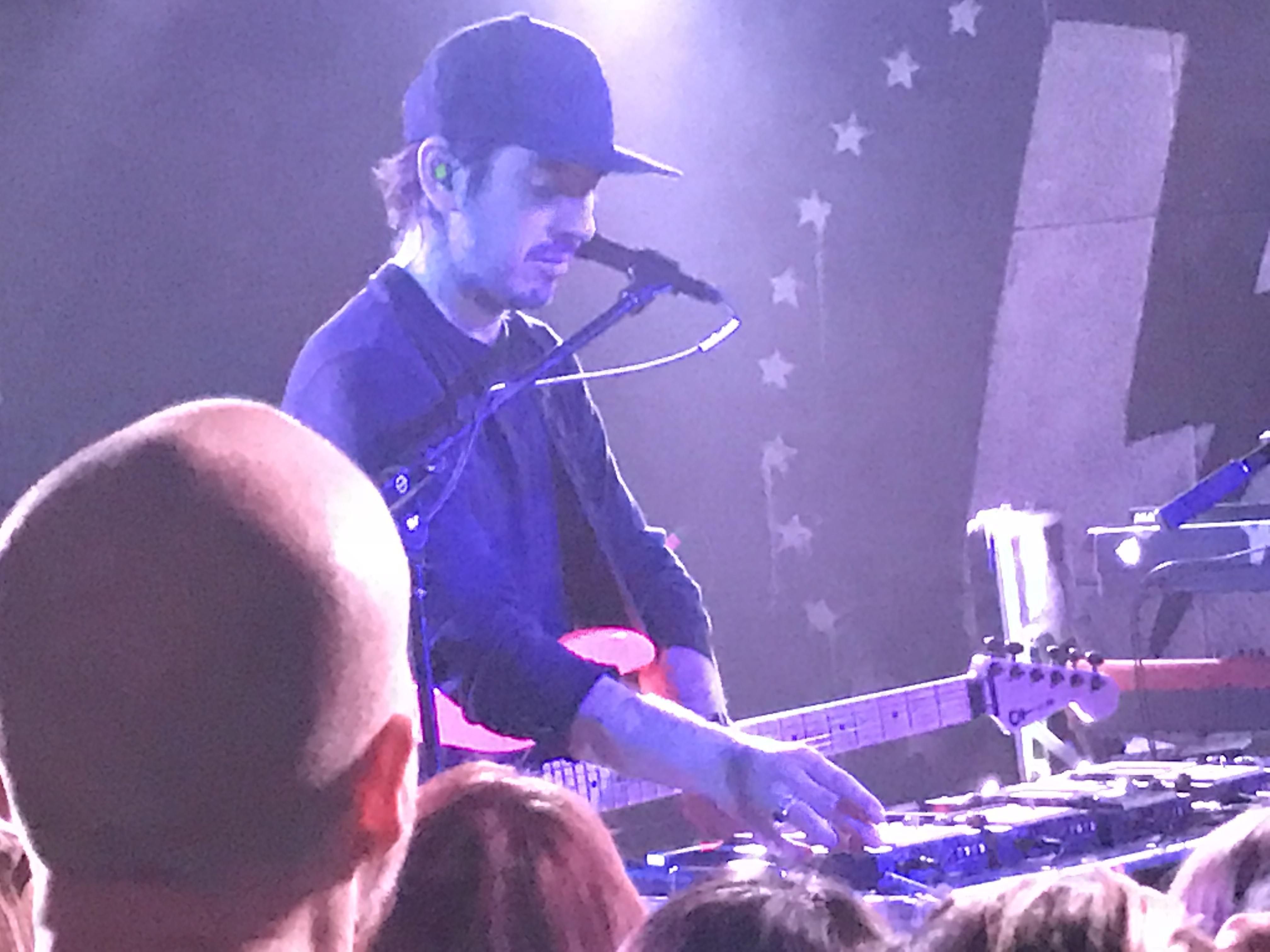 Different effects would fail; he’d always be ducking down to jiggle a pedal, then reading over to his effects table as if to keep the electronic plates spinning. He couldn’t quite hear the audience (or said he couldn’t) because of his in-ear monitors. For the encore, he had to apologize getting “hooked back into the Matrix” with the earphones.