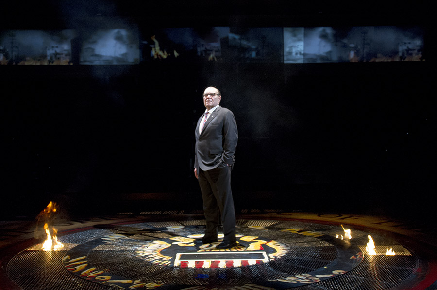The fixed metal grid of the stage allows for actual flames to dramatically shoot up from its surface at key points, during urban uprisings or when a Quaker protestor in 1965 immolated himself outside of McNamara’s office and forever changed the Secretary of Defense’s mind on the war.