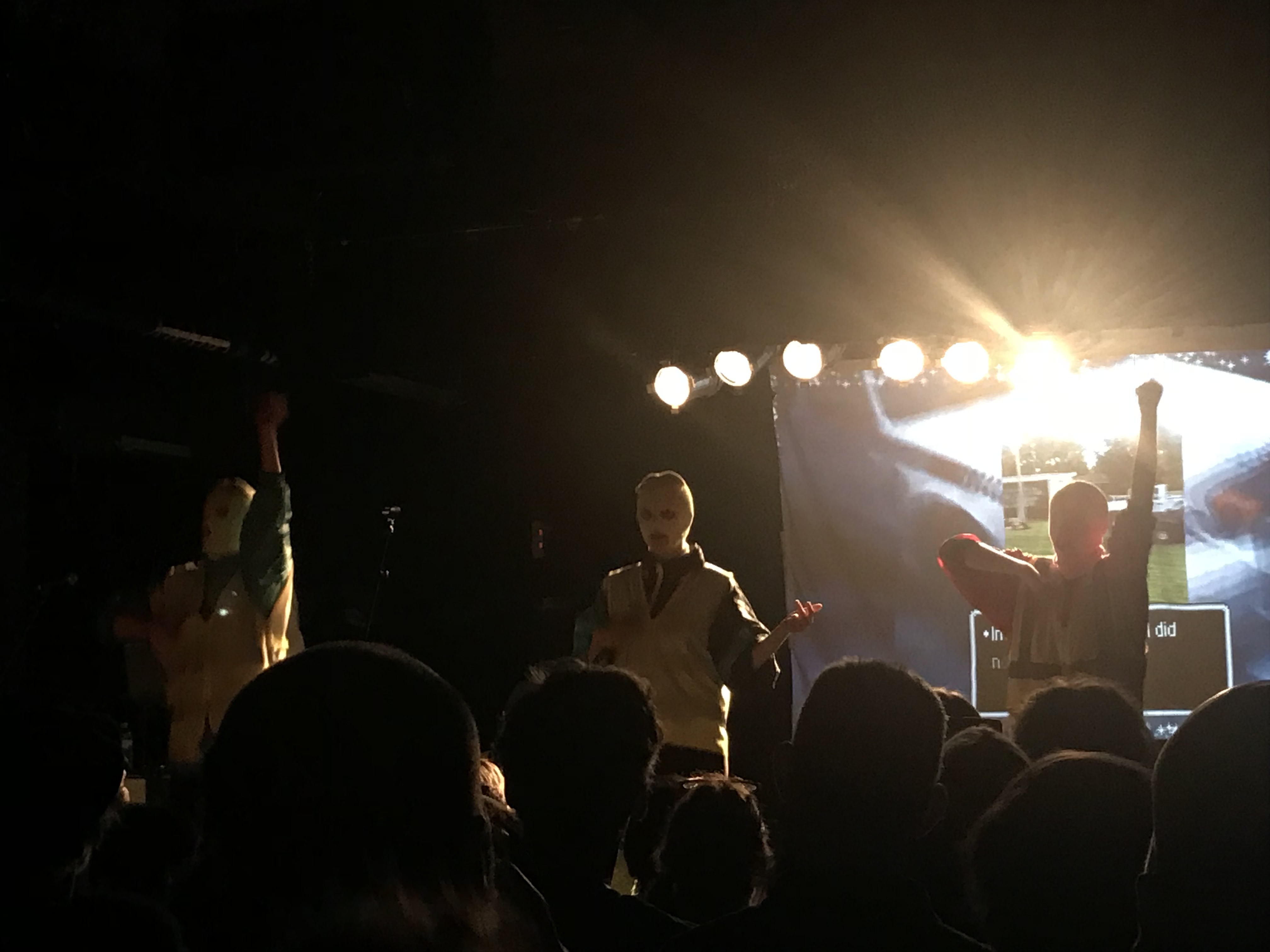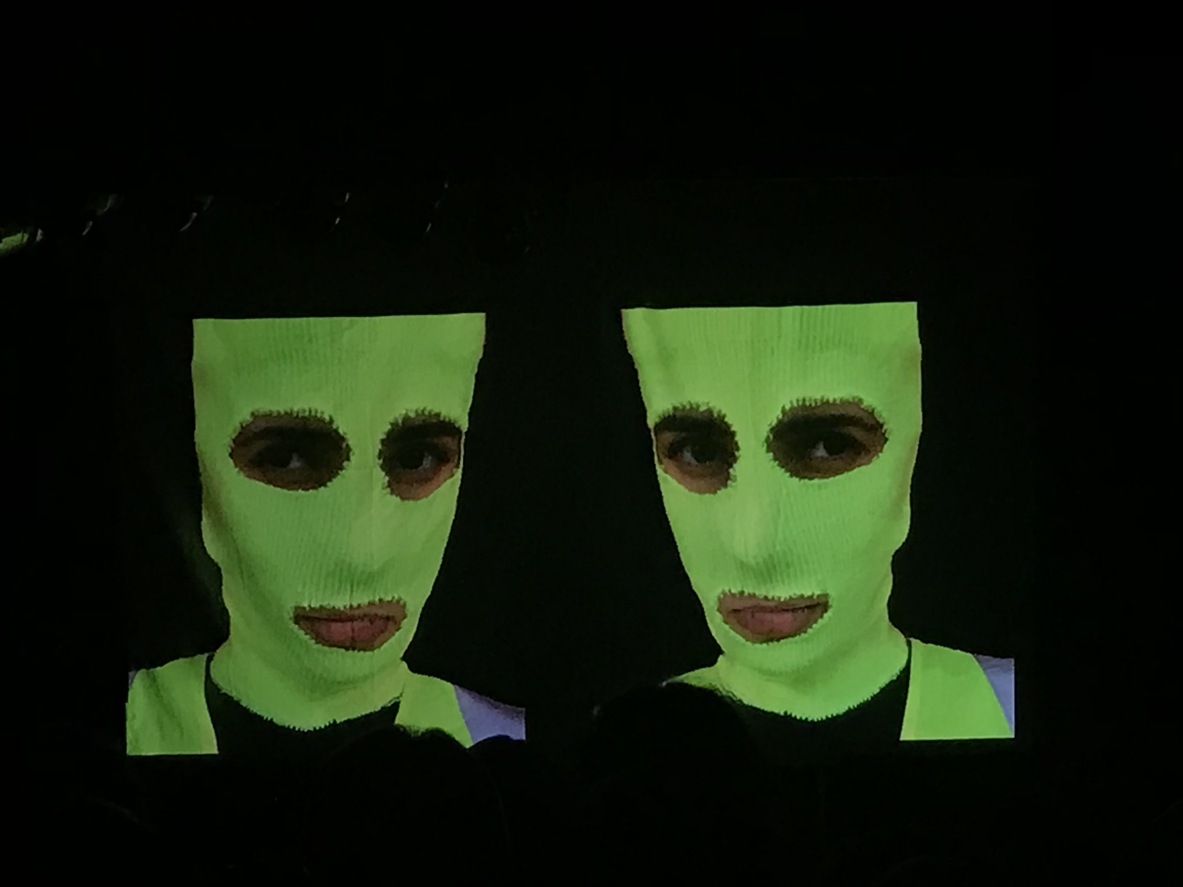 Then the group’s charismatic leader Nadya Tolokonnikova (we presume; one may never know who is under those colorful balaclavas) began the first of her rapping chants — the words repeating on the screen behind her or translating on the few tracks in which she spoke her native Russian.