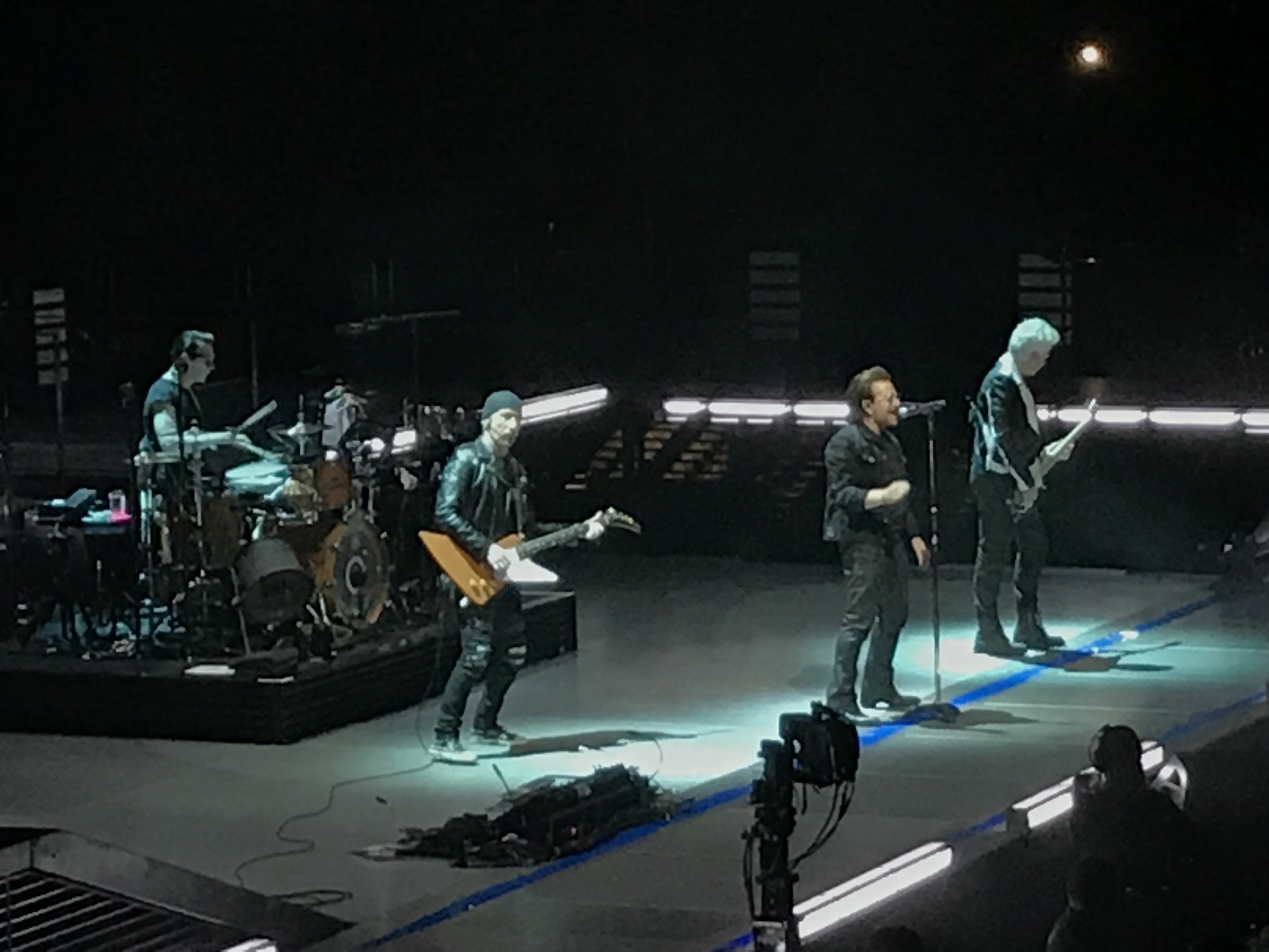 The stage setup was complicated to figure out even if you were watching it, but it involved a main stage on which the four members only occasionally performed together as one, a smaller one at the other end of the area that took up a lot of the second half of the show and between them a walkway with 80 feet of screens on both sides that illustrated each song differently and allowed the band members (but mostly Bono) to walk through a video projection instead of just having it behind him.