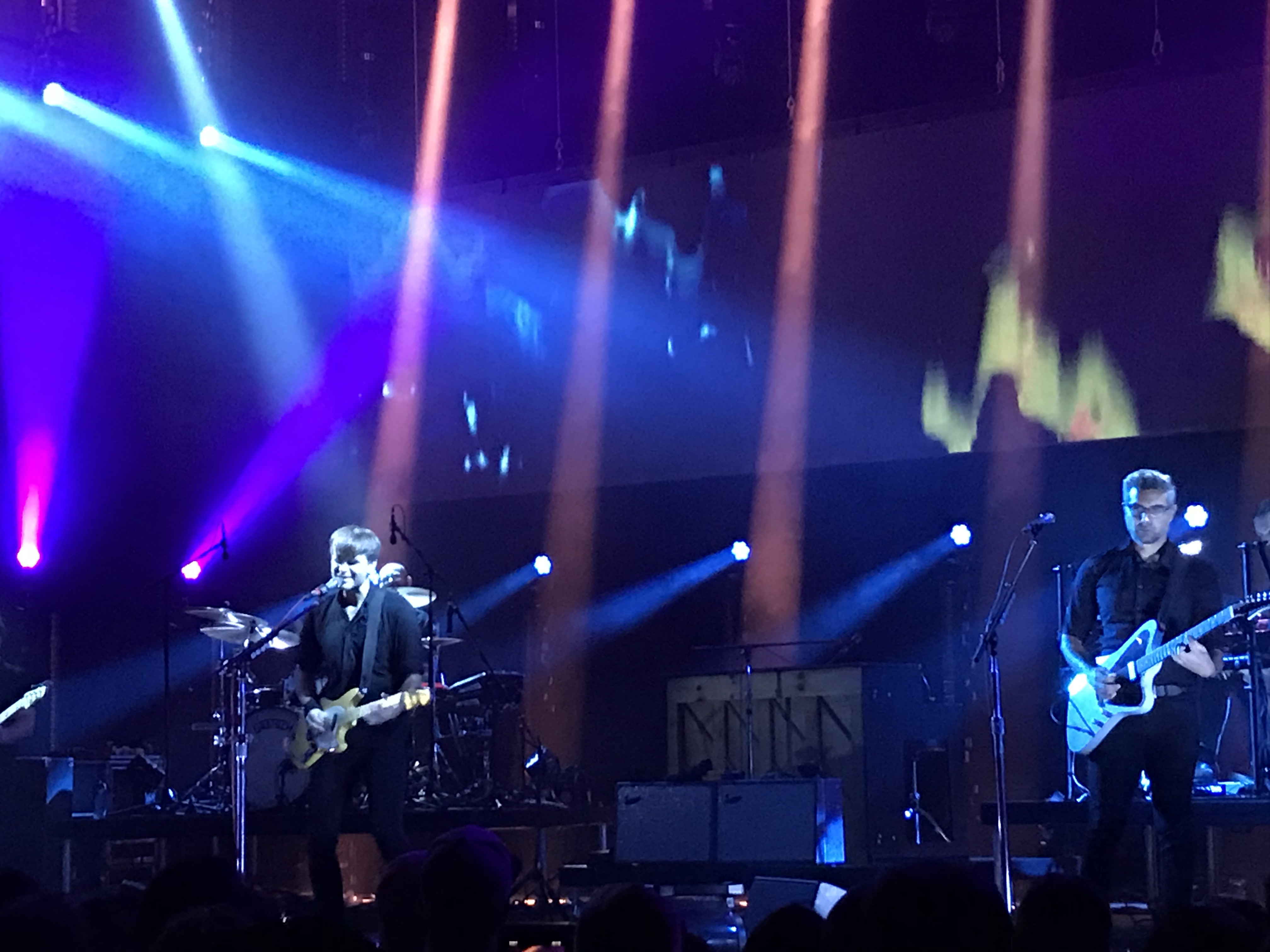 The lone clean shaven musician amongst a band of beards, Gibbard was further highlighted by an arresting lighting design, that had eight strips of versatile lights behind them and five on each side, creating a box of mood setting illumination as well as a wide video strip of constantly moving abstraction, like early Ed Paschke paintings brought to life.