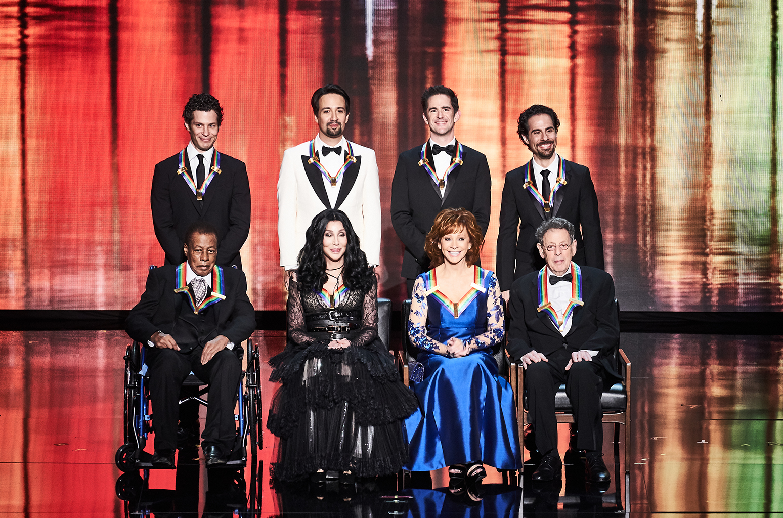 First, the roster of honorees — Cher, Reba McEntire, Wayne Shorter, Philip Glass and the creators of “Hamilton” are seen posing together, as in a tableau, on the Kennedy Center stage in the opening moments of the event. That pose usually happens at the State Department dinner the night before with the President. But Trump didn’t show for the second year in a row, and the Secretary of State didn’t either; they still posed there, though, so they posed again on stage to kickstart the event.