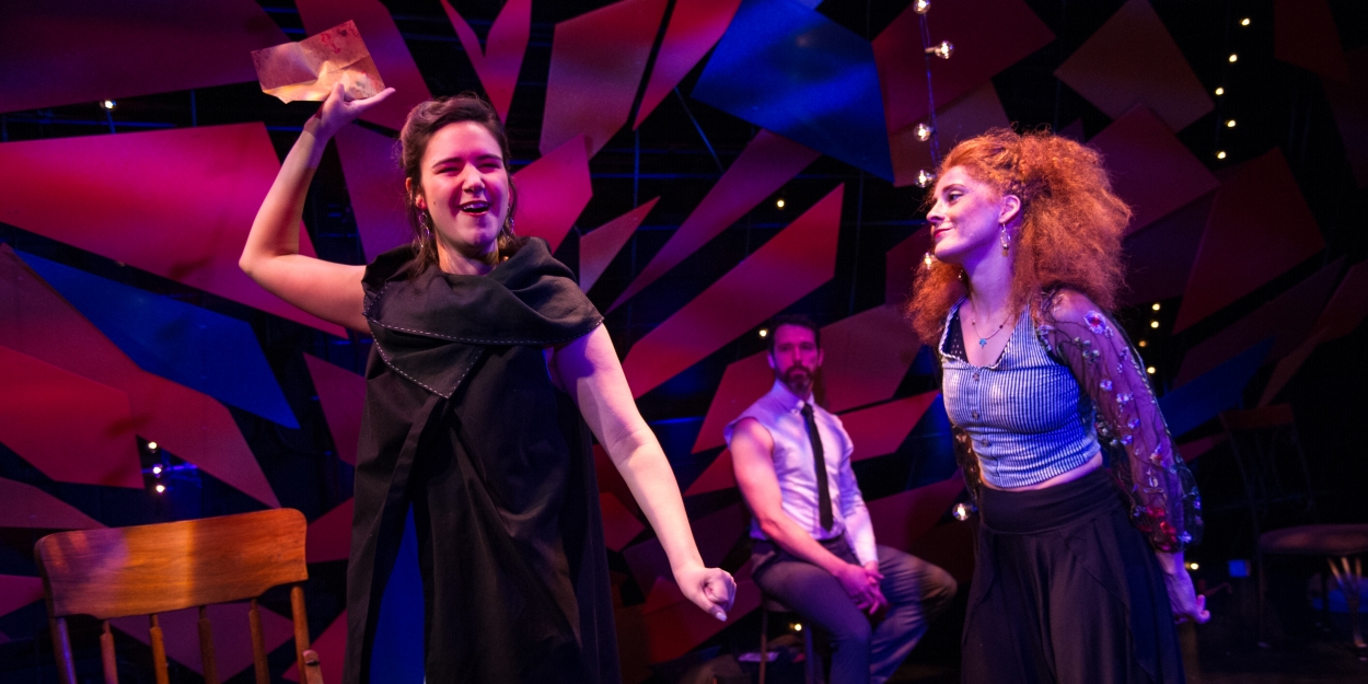 Jason Arnold’s stage design is one of colorful shards behind them, meant to evince a shattered heart or the torn pieces of letters that keep getting ripped up during the hour-long production.