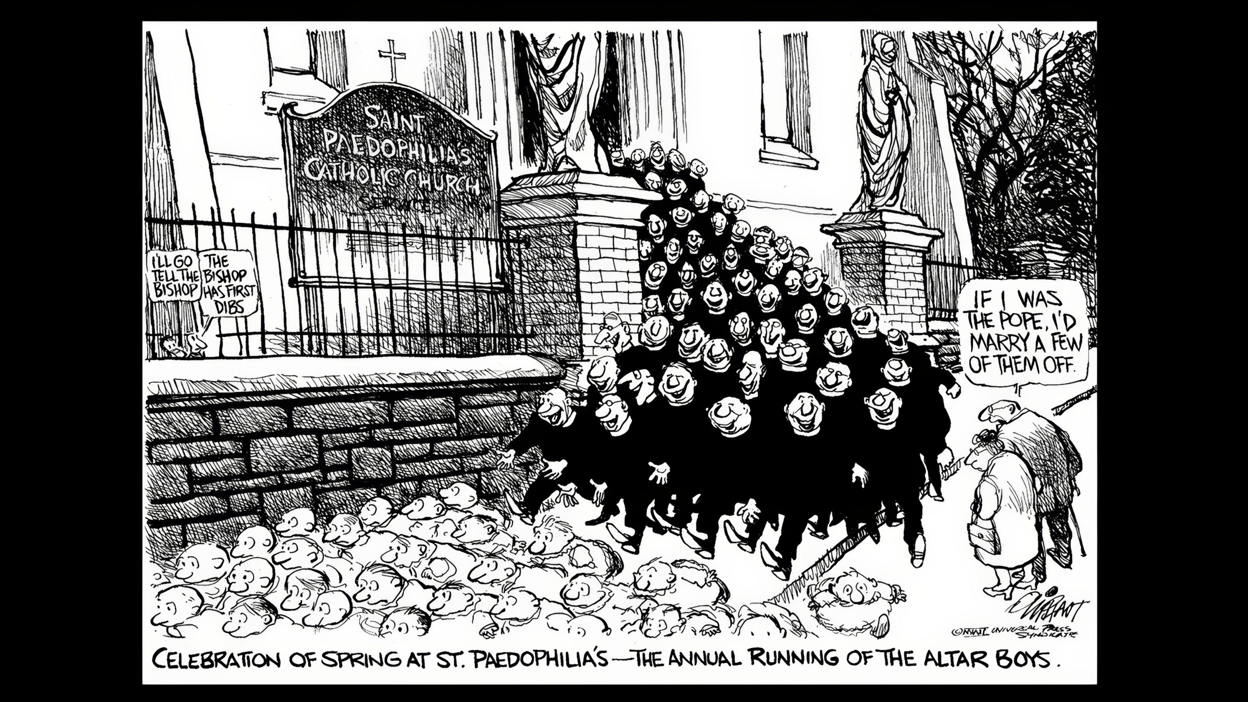 Oliphant’s more savage cartoons in his career did not come without complaint — his “Running of the Altar Boys” at Saint Paedophilia’ Catholic Church opened him up for criticism, but made its point. Oliphant, now 90, retired a decade ago, but appears in retirement to comment on his career.